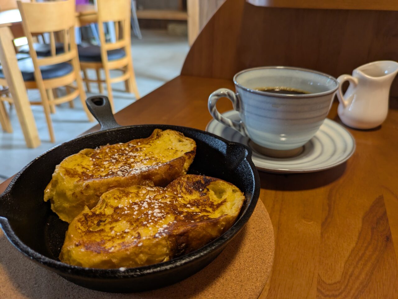 私はフレンチトーストを注文。熱々の鉄板で提供されるスタイルで、香ばしく甘い香りに包まれながら、贅沢な時間を楽しめました。