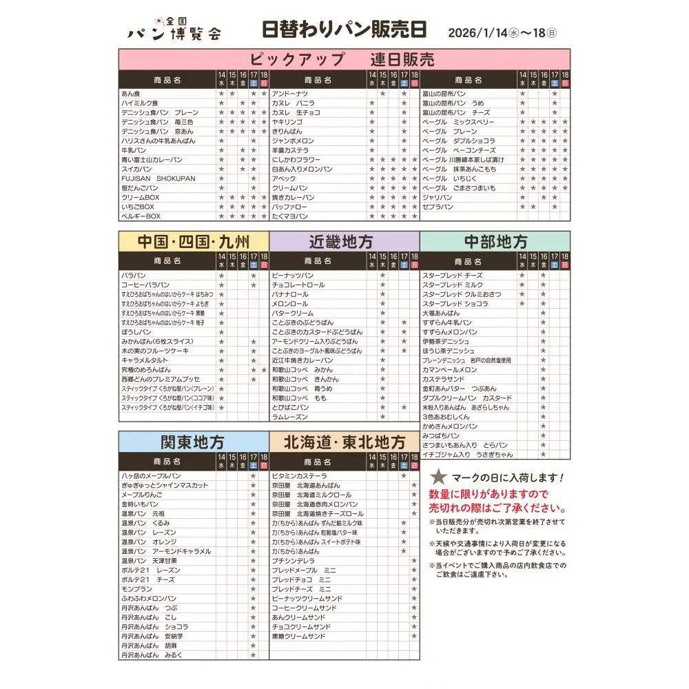 各地方の人気のパンが大集合!商品は地方ごとに日替わりで登場!毎日来ても楽しいイベントです。